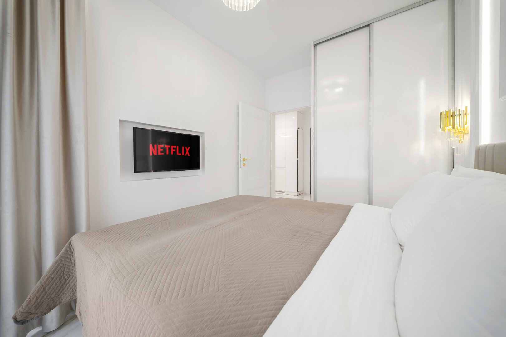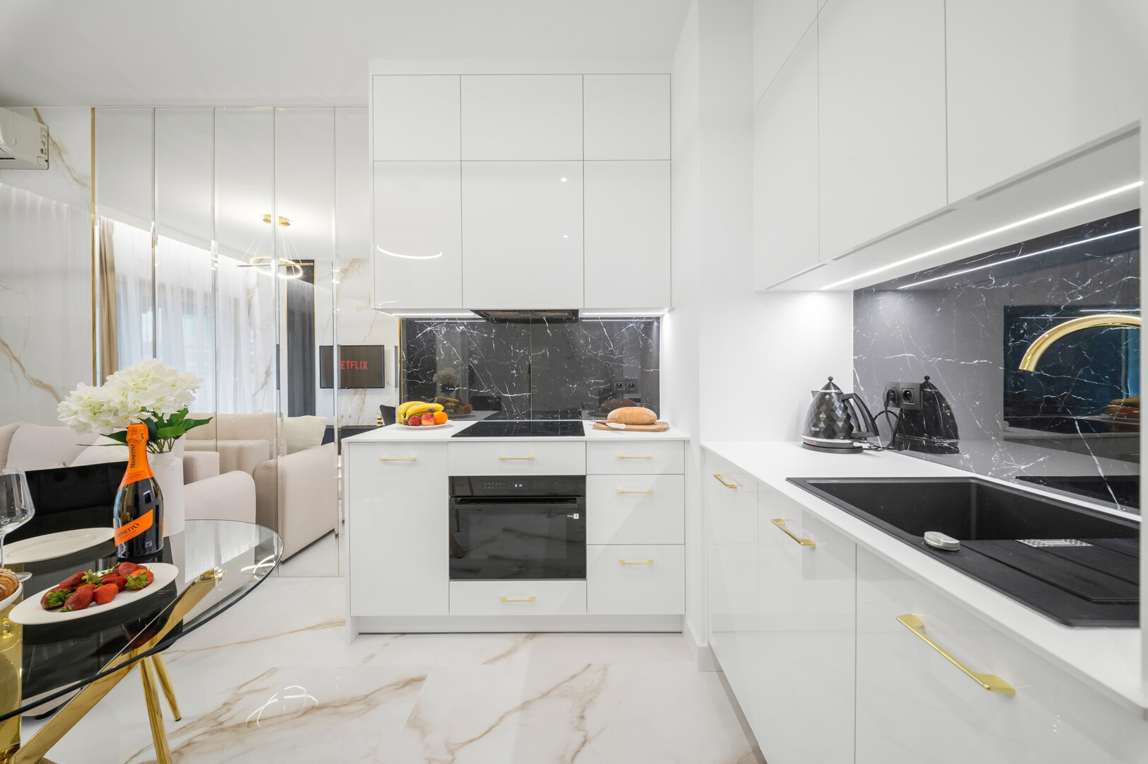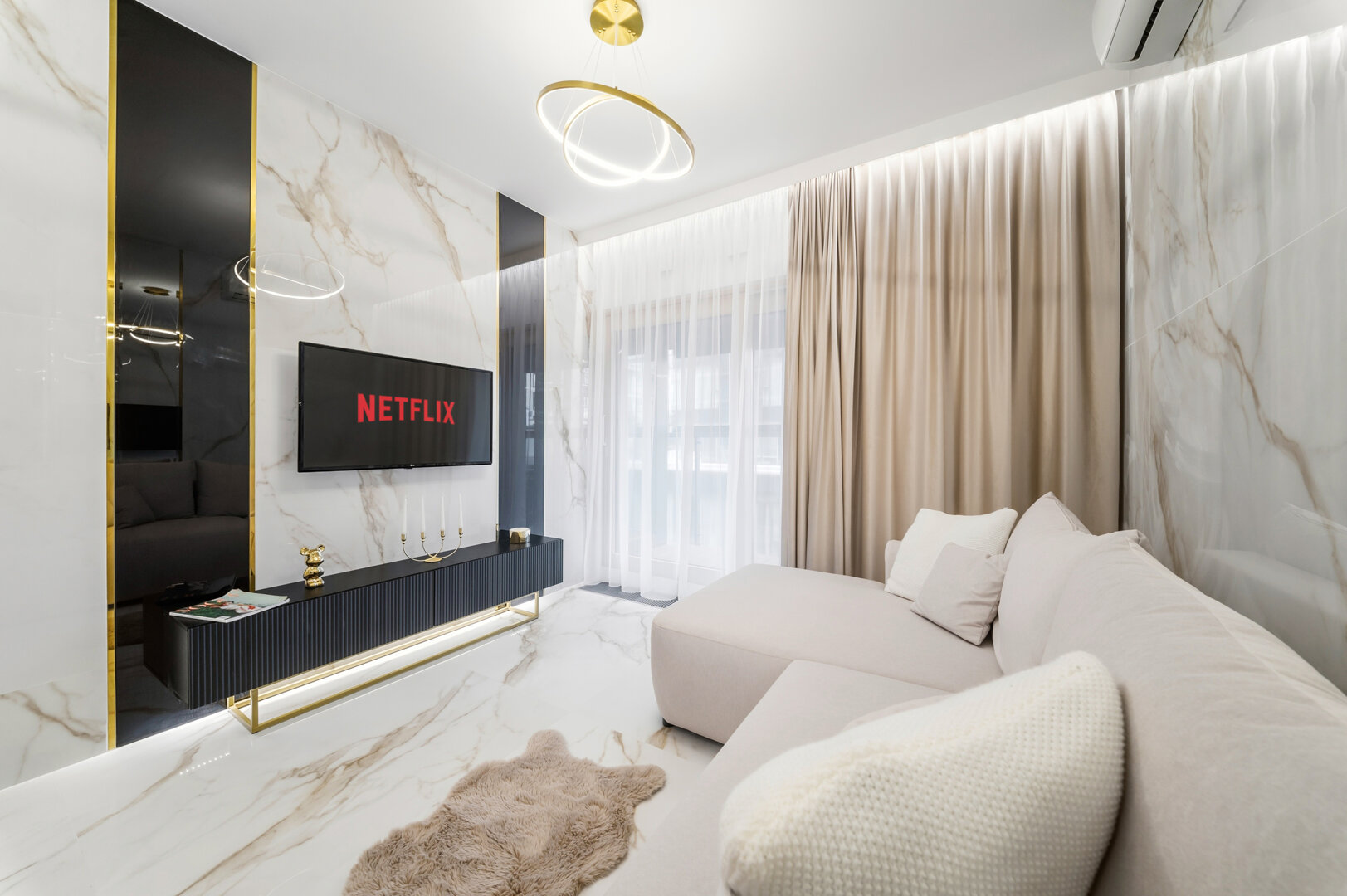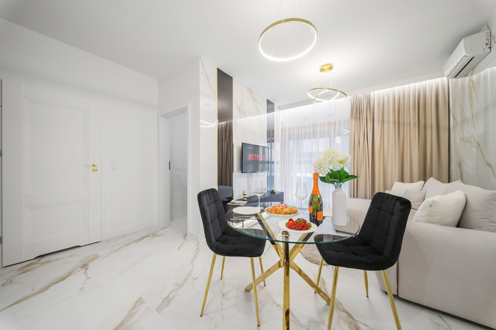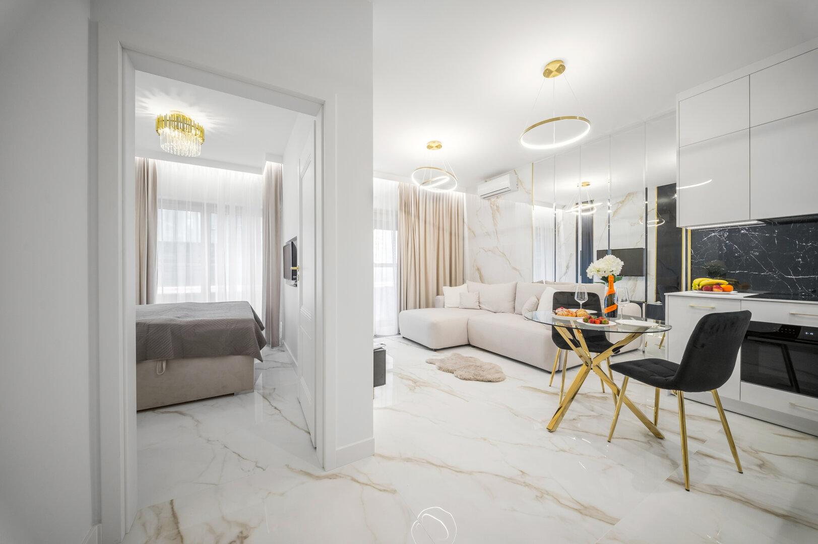 Inside the apartment you’ll enjoy a spacious living area with a comfortable bed/sleeping zone, a fully equipped kitchen (dishwasher, oven, coffee machine), a modern bathroom and a balcony. Air-conditioning, fast Wi-Fi and stylish décor guarantee a premium stay.