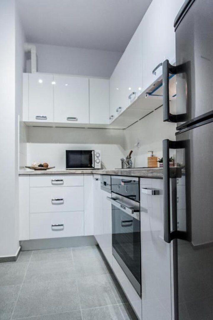 The apartment features a spacious living room with a flat-screen TV and large windows, a cozy bedroom with a comfortable double bed, a modern bathroom with washing machine and hair dryer, and a fully equipped kitchenincluding an oven, dishwasher, fridge, coffee maker and kitchenware. A balcony with a city view and elegant interior design create a bright, relaxing atmosphere.