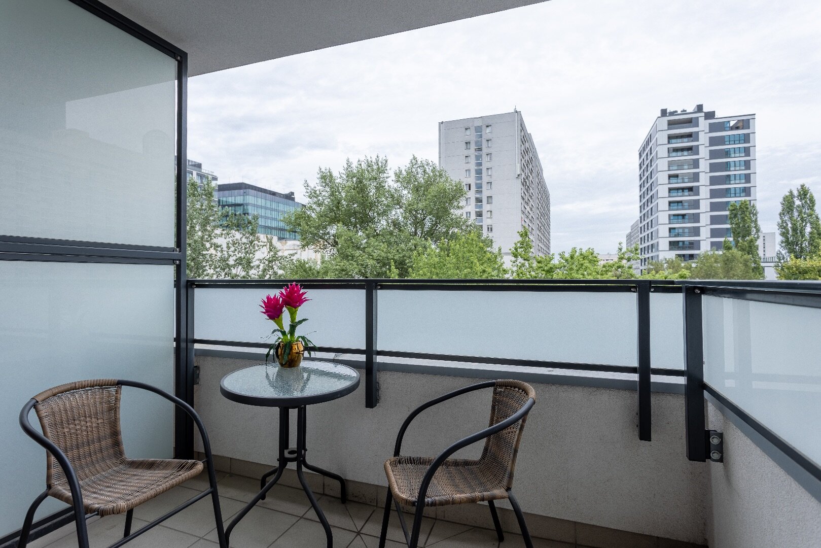 Elegant one-bedroom apartment in Warsaw’s Wola district – balcony with city view, garage parking, free Wi-Fi and air-conditioning.