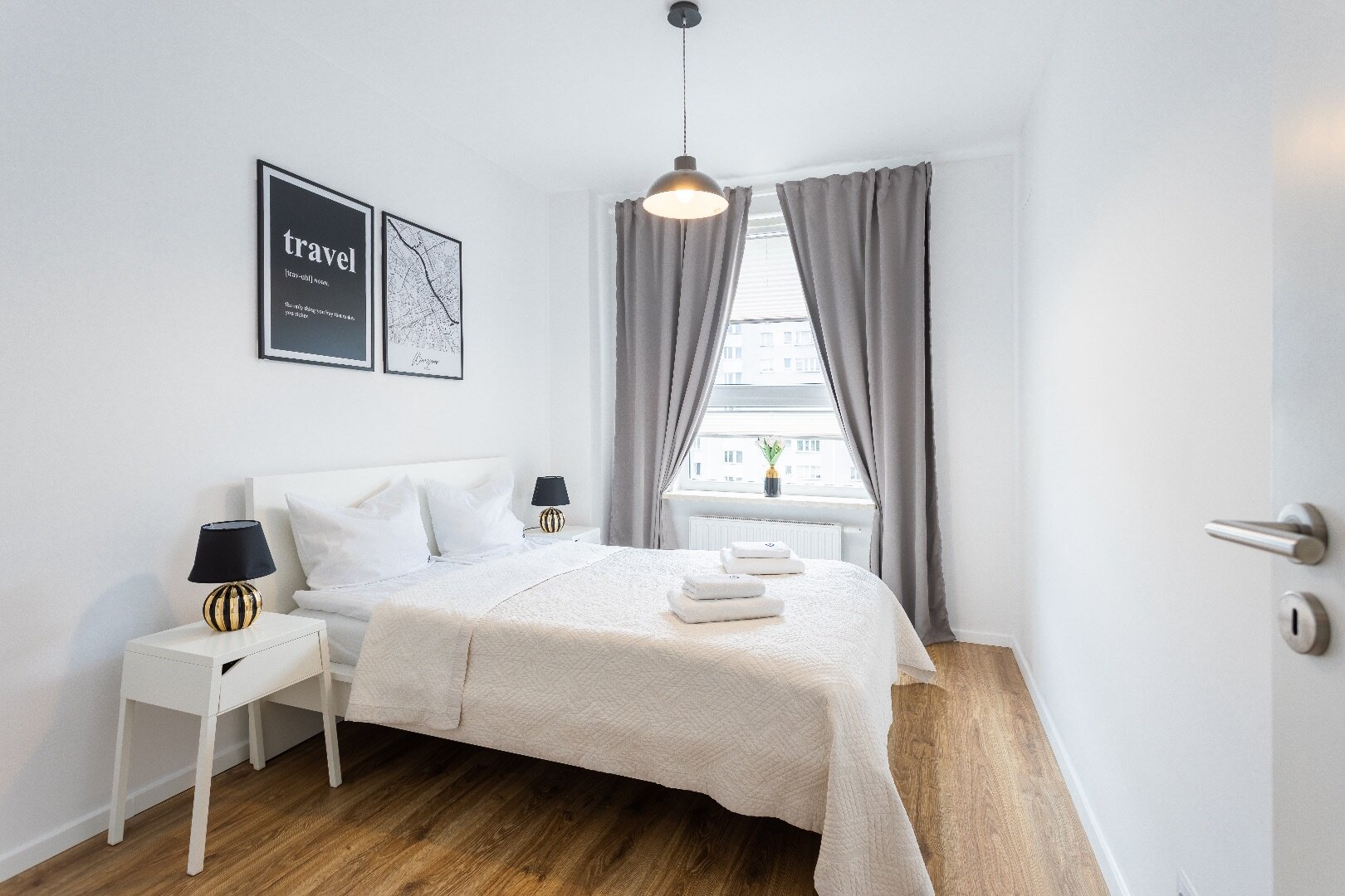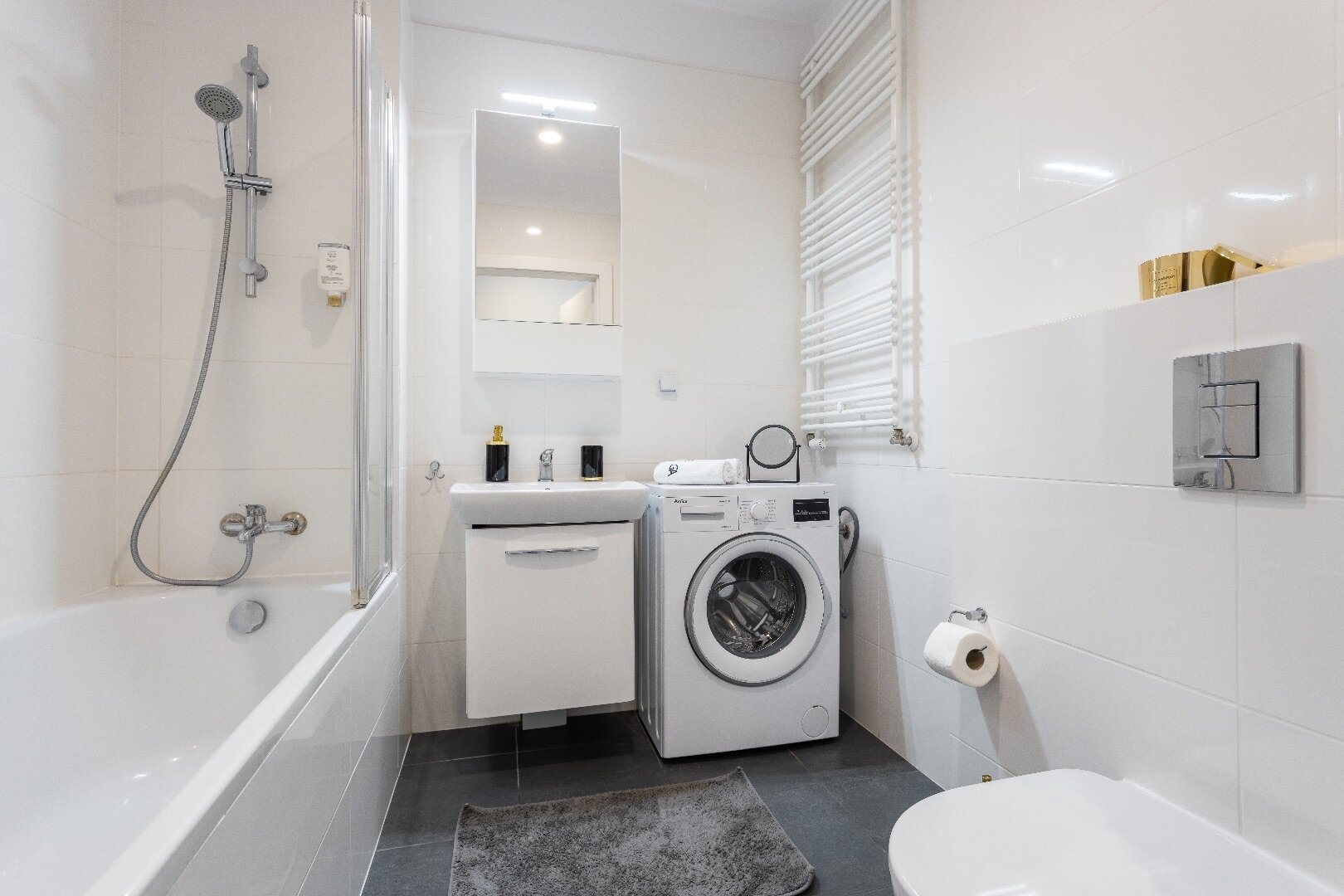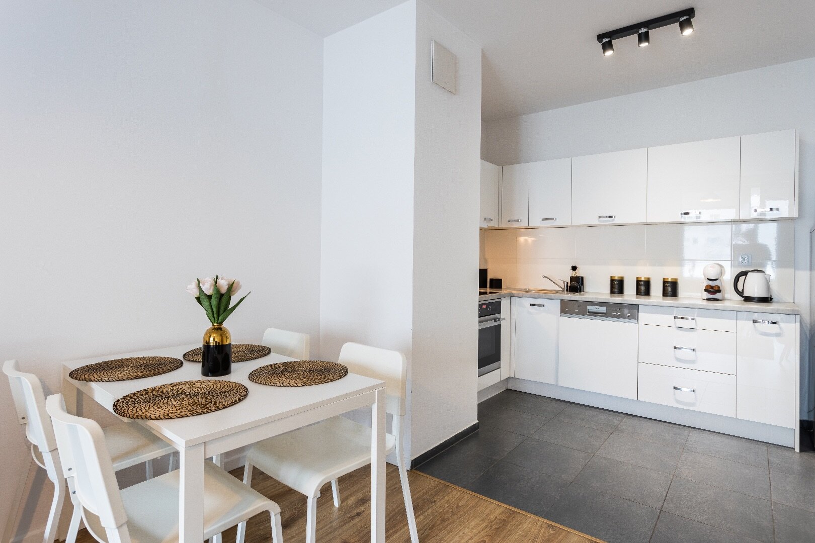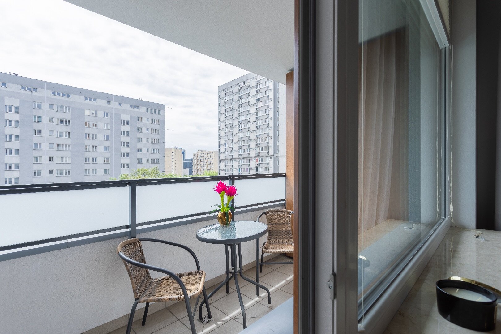 Elegant one-bedroom apartment in Warsaw’s Wola district – balcony with city view, garage parking, free Wi-Fi and air-conditioning.