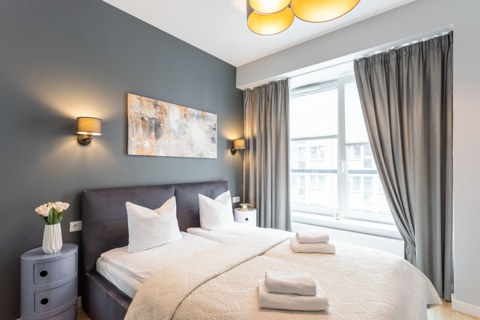 Elegant one-bedroom apartment in Warsaw’s Wola district – balcony with city view, garage parking, free Wi-Fi and air-conditioning.
