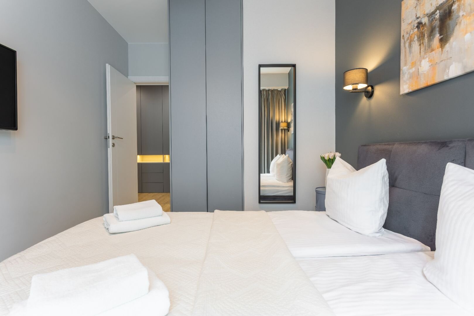 Elegancki apartament z dwiema sypialniami w centrum Warszawy (ul. Sienna 65) — idealny dla rodzin lub grup, z balkonem, klimatyzacją i prywatnym parkingiem.
